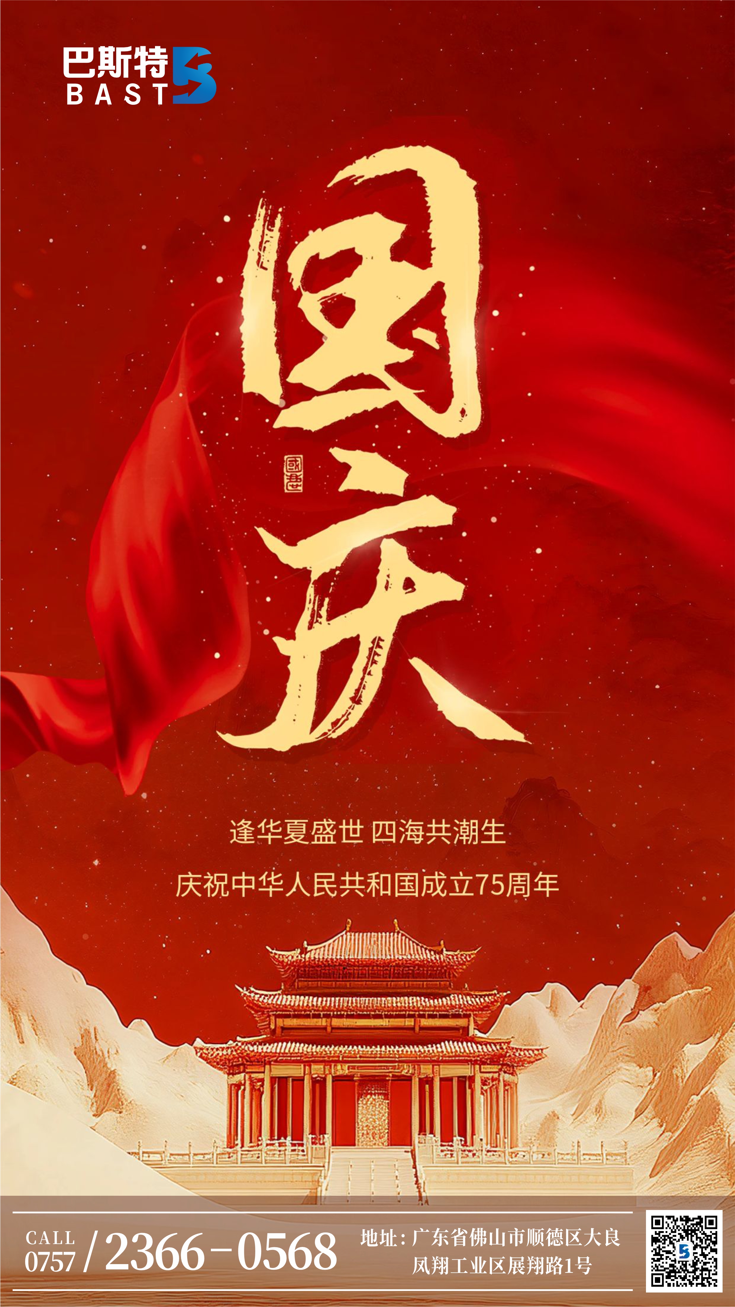 紅旗飄揚(yáng),國泰民安;盛世華誕,錦繡華章。在這金秋送爽、丹桂飄香的美好時(shí)節(jié),我們迎來了偉大祖國75周年的光輝節(jié)日。廣東巴斯特科技股份有限公司向祖國獻(xiàn)上最誠摯的祝福,向一直以來支持公司發(fā)展的廣大客戶、合作伙伴及辛勤工作的員工致以節(jié)日的問候和衷心的感謝!